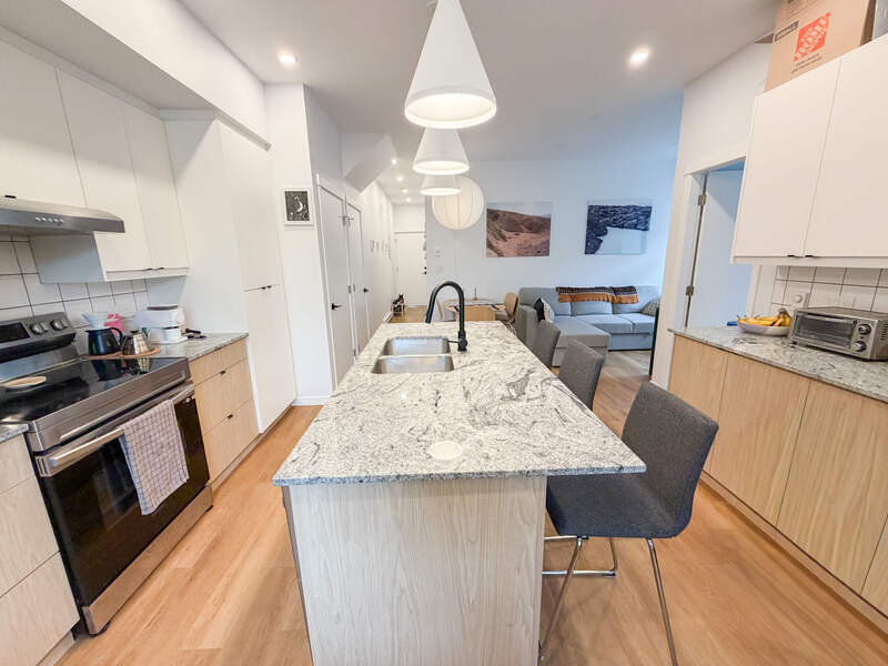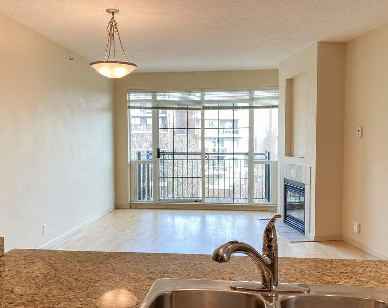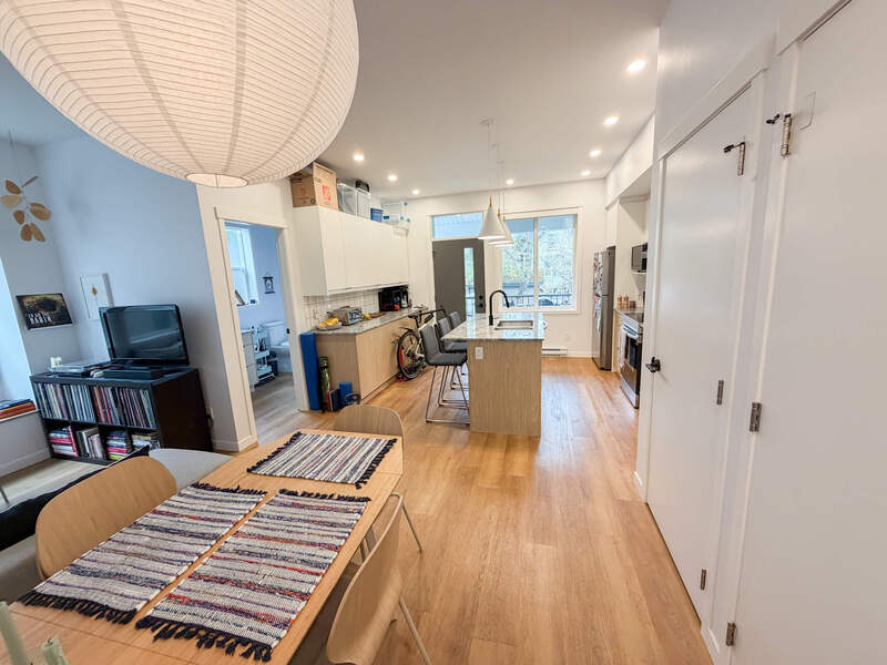 Bright and open, 2 bed + den townhome. Main level living room has 9' ceilings, large windows; opening into the kitchen – with it’s contemporary cabinetry, quartz counters, tile backsplash, under-cabinet lighting & full Stainless Steel. Features include a modern 50" linear electric fireplace in the living room, a powder room on main w/ quartz countertops. Wide plank wood laminate floors on the main floor, & plush carpeting on the stairs. Primary bedroom upstairs has a vaulted ceiling & 4pc ensuite. Single car garage and a small but private back patio area.