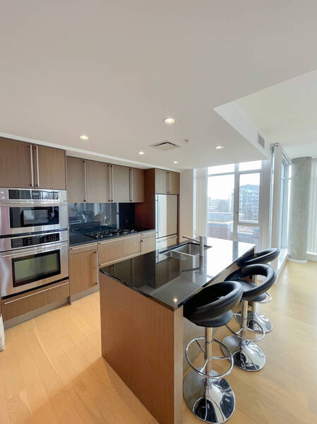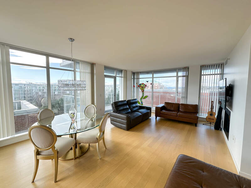 Natural light floods the open concept living and dining area through floor-to-ceiling windows. A chef-inspired kitchen features built-in ovens and gas range stovetop, high-end countertops, soft-close cabinetry with ample counter space for cooking and entertaining.