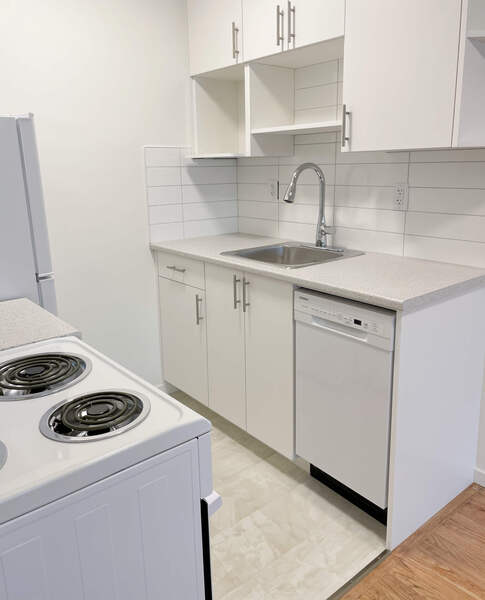 Fridge, stove, dishwasher, and shared coin-operated laundry. One Year Tenancy Agreement. No Smoking. No Pets.